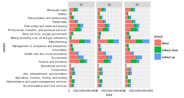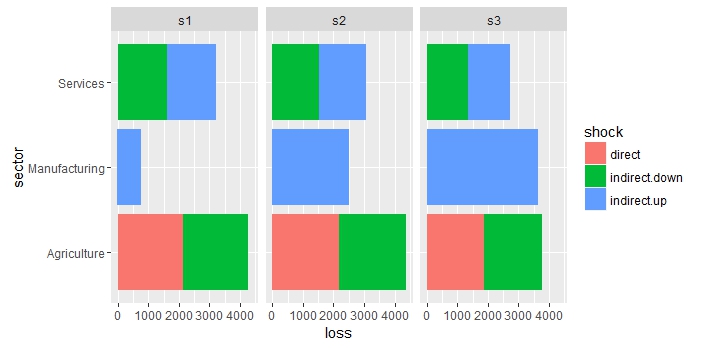 ggplot(test.df, aes(x=sector, y=loss)) + geom_bar(stat = "identity", aes(fill=shock)) + facet_wrap(~ scenario) + coord_flip()我希望每个部门的冲击都是这样的: