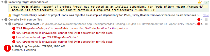 这个问题不同于推断的重复,因为这个解决方案对我不起作用。我进入了我的项目的“目标”设置,并将“只构建主动架构”转换为“否”,它消除了最初的错误,但现在我有5个新问题: