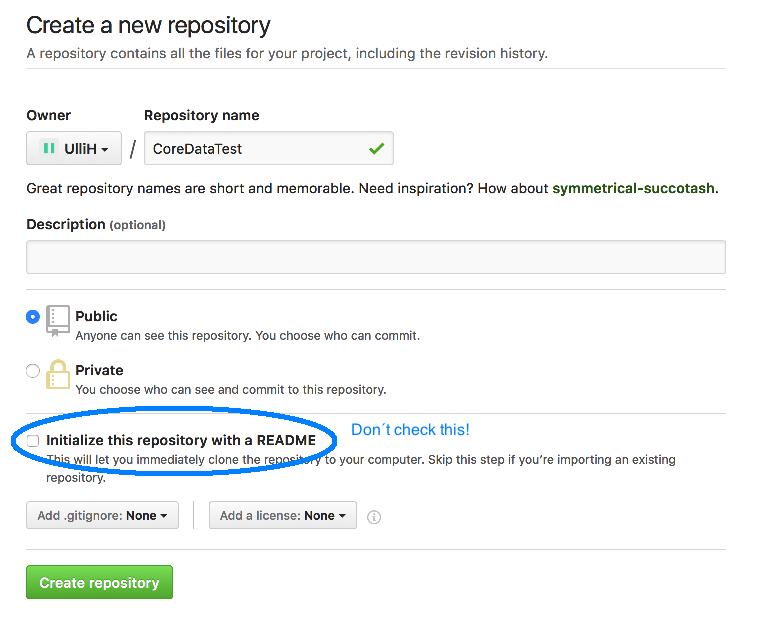 1.登录GitHub,然后单击Start a Project -> Create a new repository,输入您的名称CoreDataTest