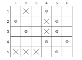 n × m板的细胞中,每个细胞不超过一个硬币。一个机器人,位于板的左上角,需要收集尽可能多的硬币,并将它们带到右下角的单元格。在每一步中,机器人可以将一个单元移动到右边,也可以从当前位置向下移动一个单元。当机器人用硬币访问一个牢房时,它总是捡起那枚硬币。设计了一种算法来找出机器人可以收集的硬币的最大数量,以及它需要遵循的路径。 如果机器人无法访问棋盘上的一些单元,您将如何修改硬币收集问题的动态规划算法?把你的算法应用到下面的板上,在这里,无法访问的单元格用X表示。这个板有多少条最优路径?
