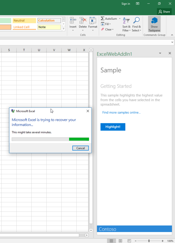 当我在Excel的带中单击“显示任务窗格”时,Excel会崩溃。