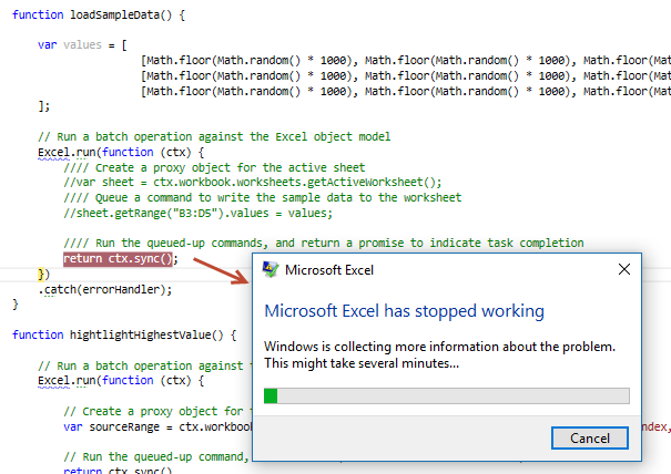 Faulting package-relative application ID: 我已经注释掉了一些代码,并进行了逐行遍历,当我试图跨过/进入ctx.sync()时,它会崩溃。