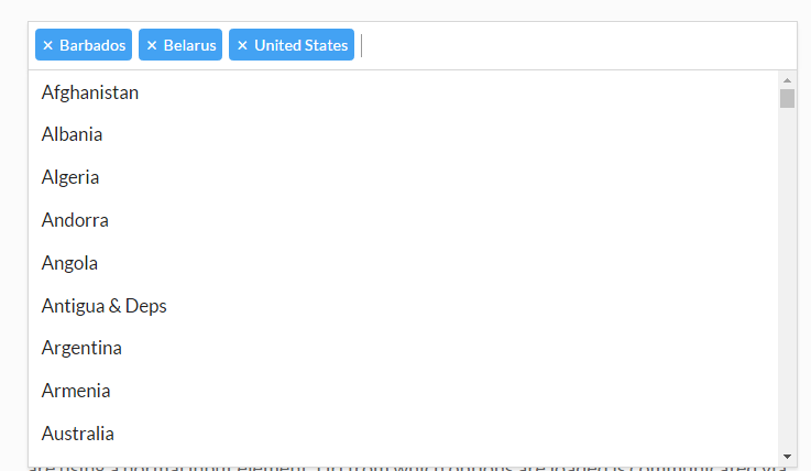multi-select -在单击某一项后,使angucomplete保持打开。excluded-items --用于隐藏在加载阶段已经选中的项。exclude-on-select -当单击一个项目时,它会在单击它们之后立即隐藏它。exclusion-comparer-field --当您从数据库加载数据并希望通过某些特定字段(而不仅仅是JS引用)比较排除的项时,这是非常方便的。我们使用id。4.向控制器添加vm.addSelectedItemFromRemoteAutocomplete函数。这将将实际选定的项添加到属性中。