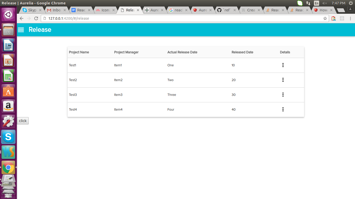 这样做,这里我的视图是在react js中,同时单击表中的细节(被宠坏的图标),需要调用应该在aurelia中的函数。我按照上面提到的文档进行编码,而不是my-react-element.jsx中的列表,而是改为表样式,如图中所示。