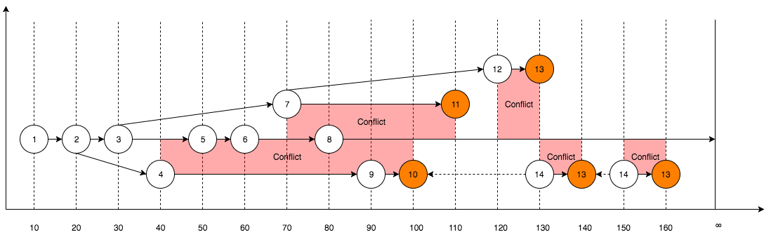 }这种数据结构形成了一棵树,它可以用以下图表来描述(白色记录表示普通的数据携带记录,红色记录的data属性等于表示删除操作的null ):