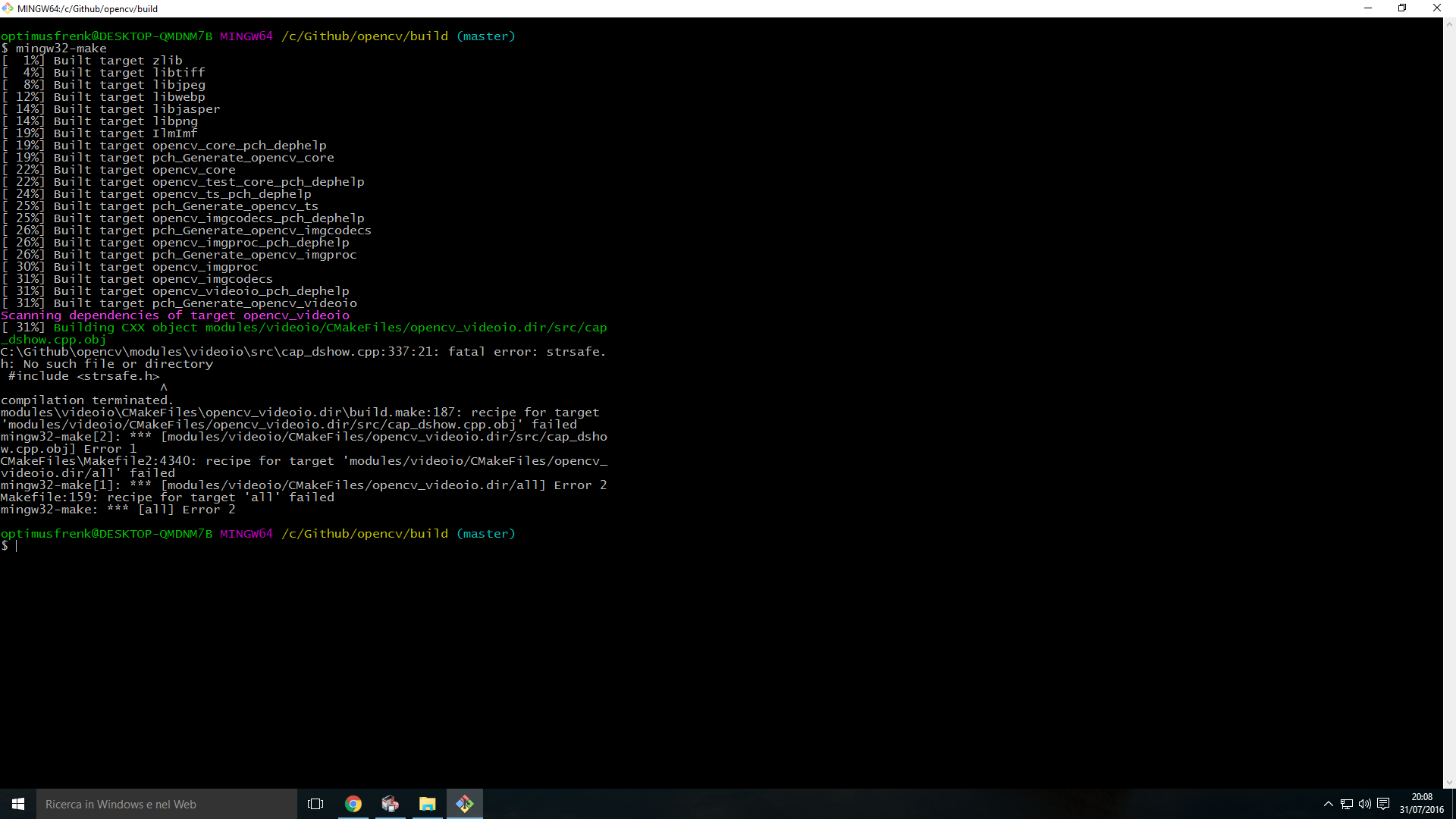 C:\Github\opencv\modules\videoio\src\cap_dshow.cpp:337:21: fatal error: strsafe.h: No such file or directory #include <strsafe.h> ^ compilation terminated. modules\videoio\CMakeFiles\opencv_videoio.dir\build.make:187: recipe for target 'modules/videoio/CMakeFiles/opencv_videoio.dir/src/cap_dshow.cpp.obj' failed mingw32-make[2]: *** [modules/videoio/CMakeFiles/opencv_videoio.dir/src/cap_dshow.cpp.obj] Error 1 CMakeFiles\Makefile2:4340: recipe for target 'modules/videoio/CMakeFiles/opencv_videoio.dir/all' failed mingw32-make[1]: *** [modules/videoio/CMakeFiles/opencv_videoio.dir/all] Error 2 Makefile:159: recipe for target 'all' failed mingw32-make: *** [all] Error 2