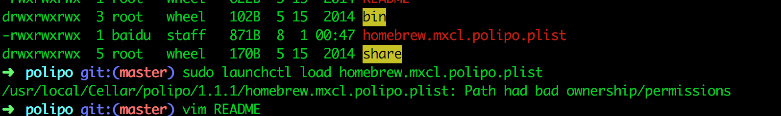 sudo chown baidu homebrew.mxcl.polipo.plist/usr/local/Cellar/polipo/1.1.1/homebrew.mxcl.polipo.plist: Path had bad ownership/permissions
