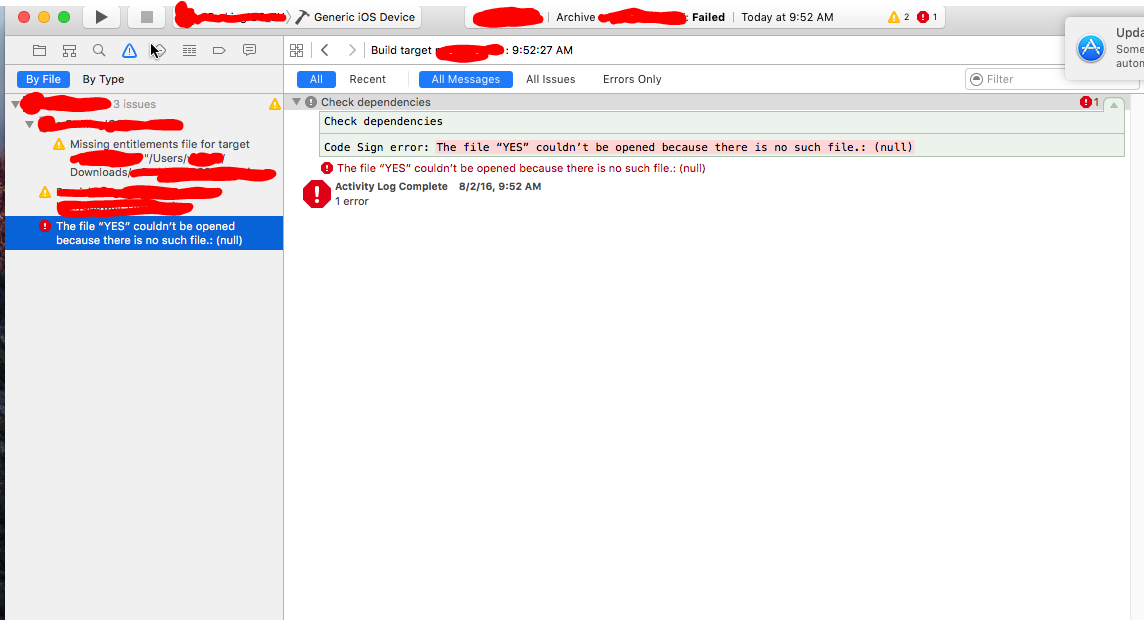 您可能已经提供了"YES"作为文件名,或者"YES"作为项目中任何位置的值。这是不允许的,因为它是预先保留的字. 因此,您需要在项目中使用不同的名称/值。