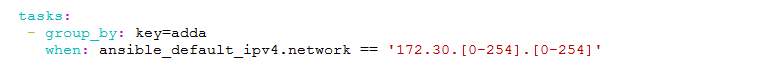 任务:- group_by: key=adda when: ansible_default_ipv4.network == '172.30.0-254.0-254‘
