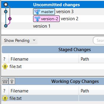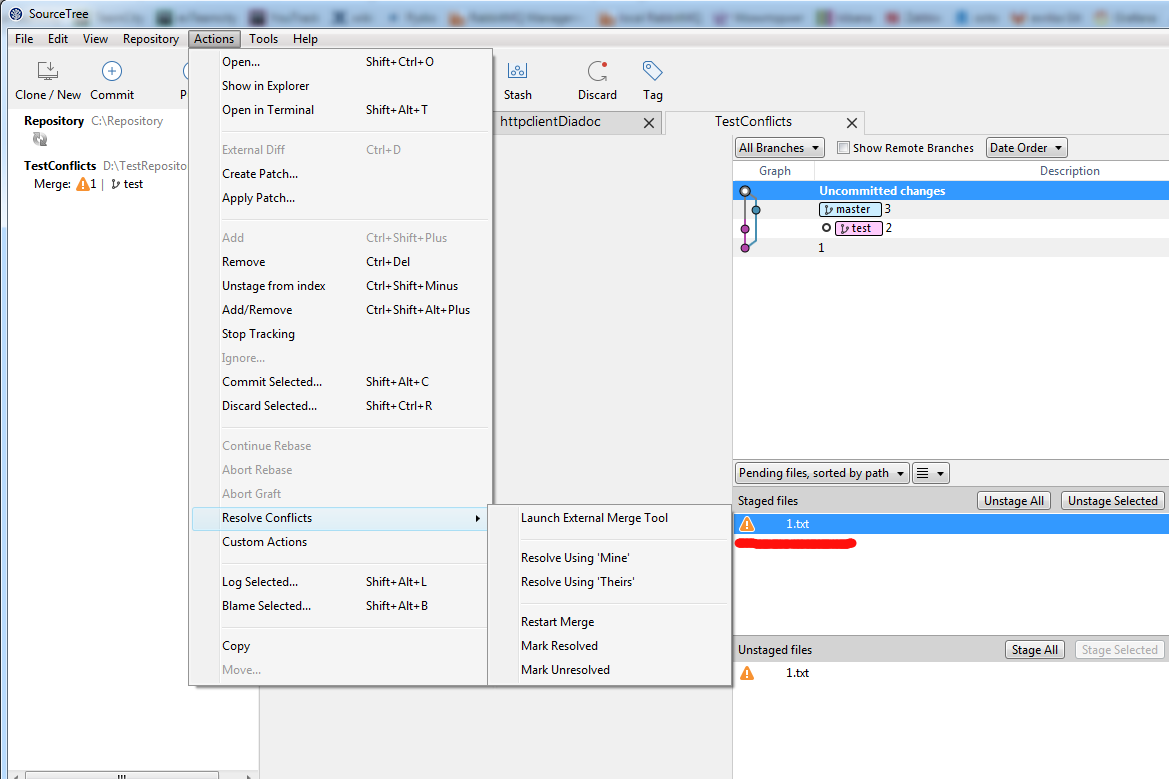 以下是SourceTree如何显示合并后存在冲突: