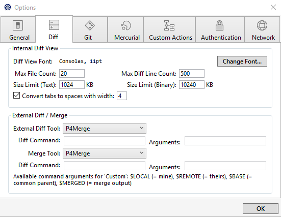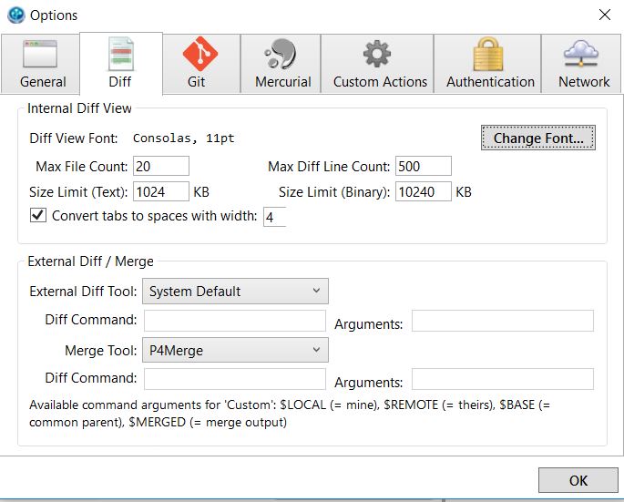 我有SourceTree版本1.5.2.0,我配置了外部合并工具,如屏幕截图所示。P4Merge安装在C:\Program \Perforce中,不在Path上。我没有在.gitconfig中设置任何关于diff/merge工具的特定值(我意识到这是某种“在我的机器答案上的工作”,但它确实很简单)。