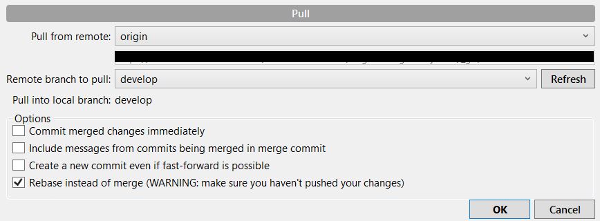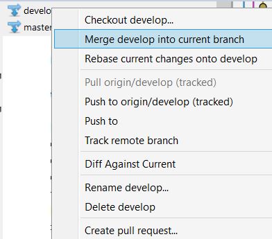 对于工作流,不同的团队可能有不同的方法。我们团队中对每个特性工作(通常只有一个开发人员完成)所做的工作如下(如何在SourceTree中执行每个操作的屏幕截图在文章末尾):