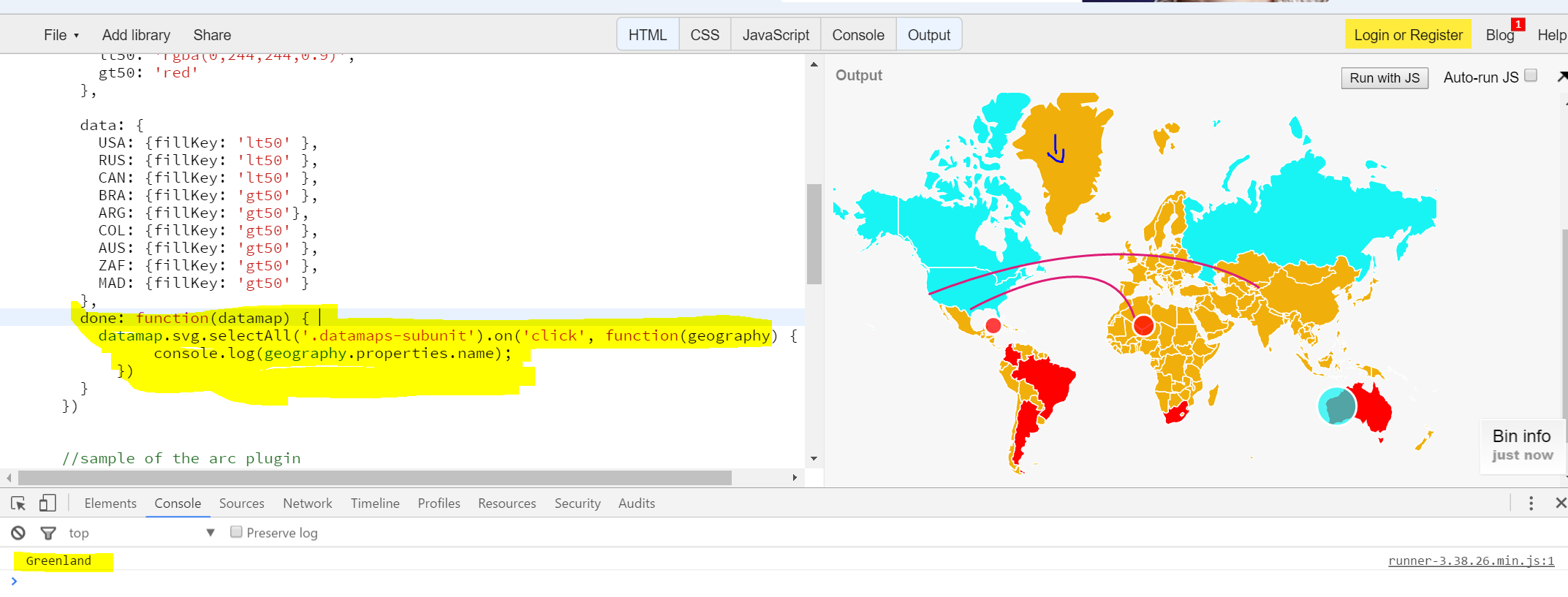 我正在查看数据地图库的D3,我想知道如何操作svg内容。假设我看了基本的世界地图,我如何通过点击加拿大运行一个alert("Selected")?或者点击它来改变它的背景色?