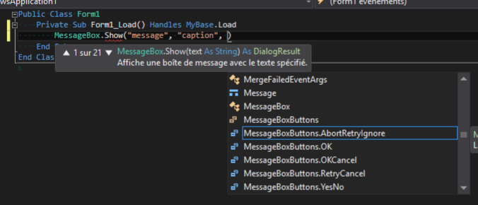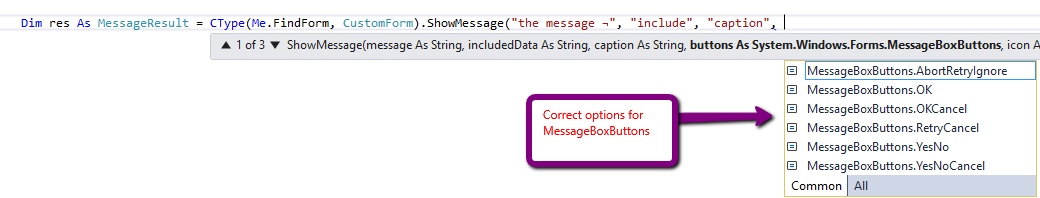 在更复杂的情况下,这也是真正的,当从方法的多个重载版本中选择时,您可以向下箭头穿过重载,直到到达正确的重载,然后再次键入空间,它将为列表中的参数提供正确类型的正确枚举值的选择。