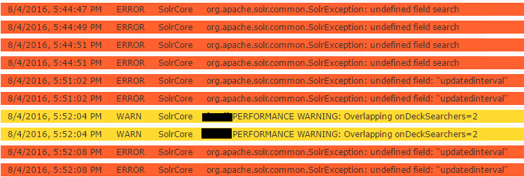 我使用的是SOLR,在生产环境中,我在SOLR日志中得到了很多错误,但是站点运行良好,我使用的是32 solr核,我使用的是Solr版本4.10.3.0和Sitecore 8.1更新2,下面是这些错误的示例,任何人都可以向我解释这些错误: