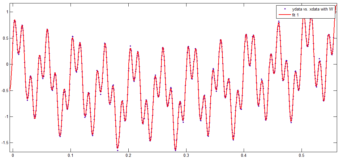 % `In above code, phase parameters are not included, they might be added.我发现,使用优化工具箱中的“lsq弧度”指令,定制函数拟合比“fit”函数更可行、更容易。我在下面的代码中测试了它,使我的数据符合12 (>8) sines的总和: