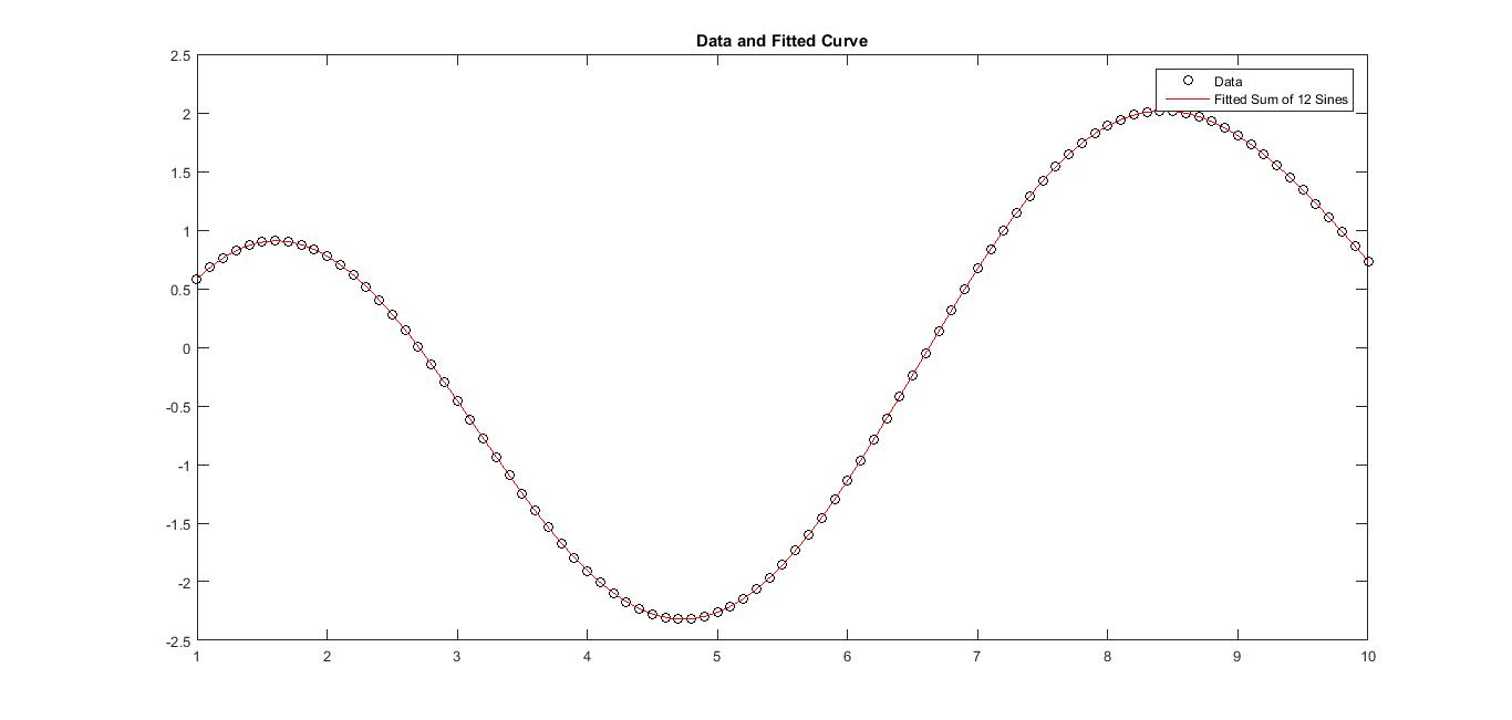 我试图将一些数据拟合成MATLAB中的正弦函数之和,但是MATLAB中的正弦函数项的数目是有限的,即1≤n≤8,但是,在拟合函数中需要更多的项,即超过50项。是否要用MATLAB将我的数据拟合成一个正弦函数之和,其中有超过8个正弦项?为什么MATLAB中存在这样的约束(技术上还是任意的)?是否有适合正弦函数的工具箱(特别是能够支持访问数据的工具)?