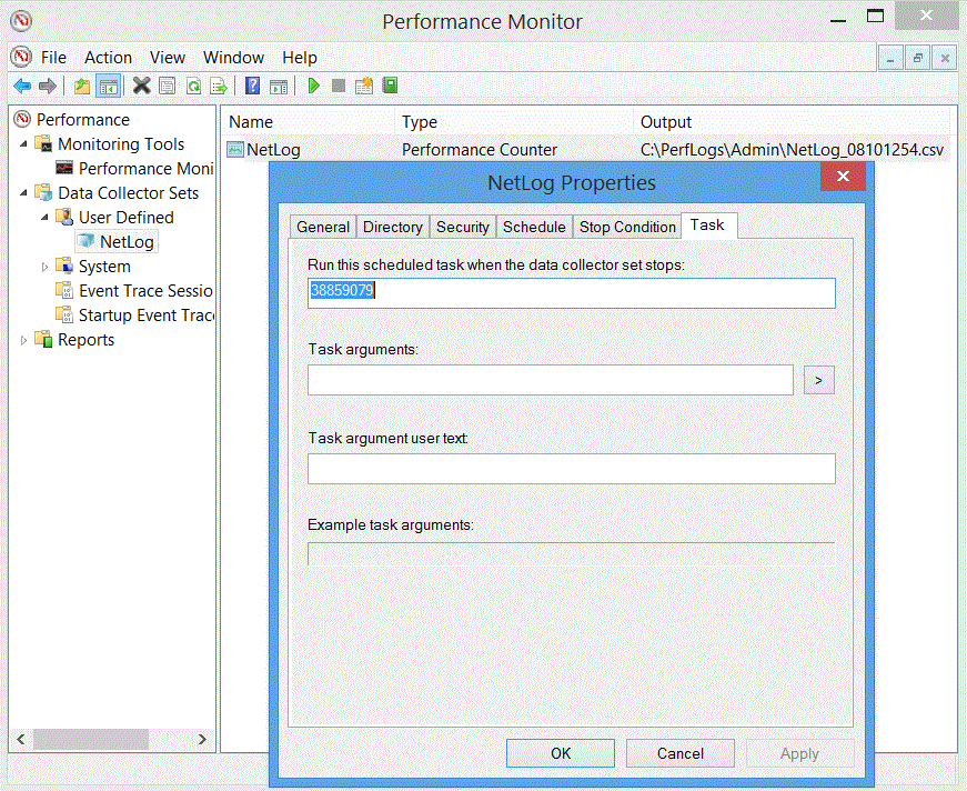 注意,-rc开关参数是-rc <task> (在较早的Technet文档是-rc FileName中)。那么<task>代表什么呢?阅读数据收集器集属性和/或运行perfmon.exe,见下图: