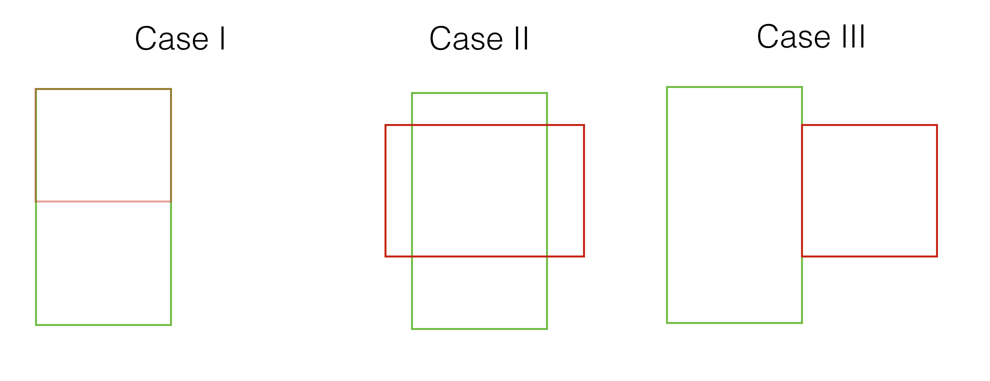 我在ES里有两个geo_shapes。我需要弄清楚的是最好的方法来理解其中一个形状(绿色)是否包含或与另一个(红色)相交。请参阅以下三种不同案例的视觉表现: