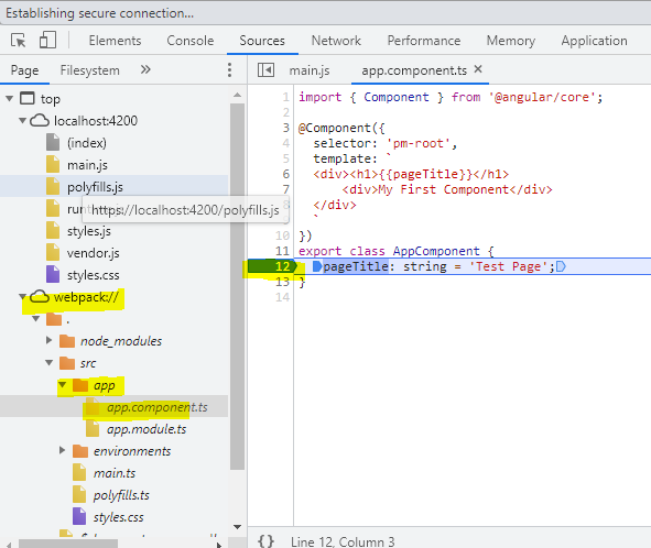 }然后,您将能够在“源”选项卡中看到TypeScript文件,并在其中添加断点。