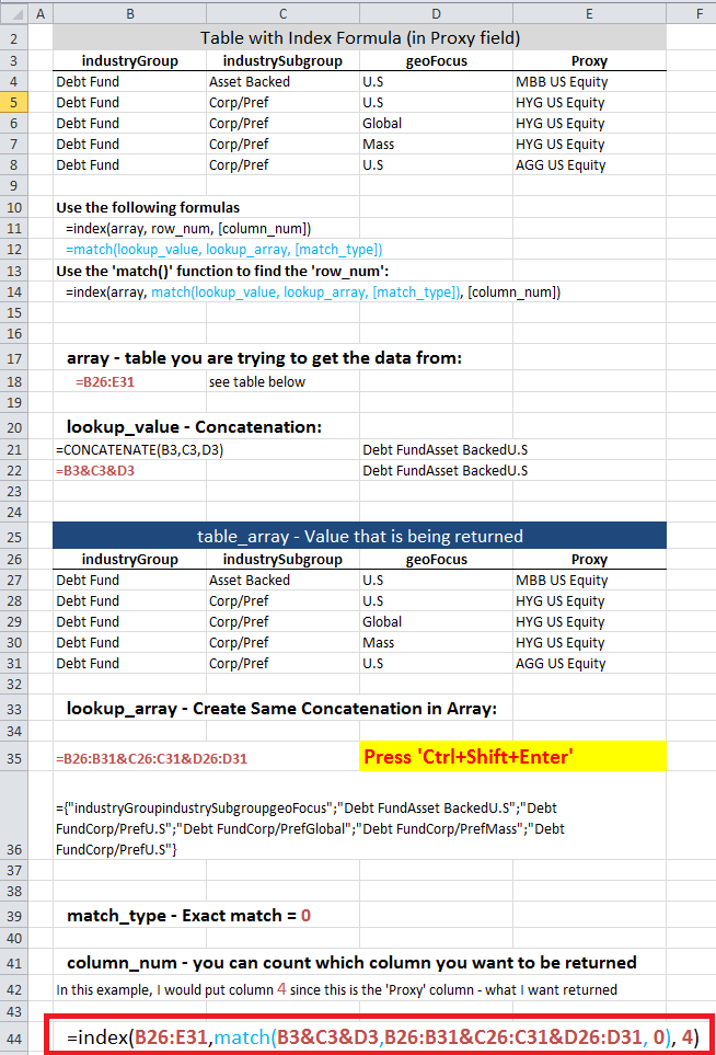 这是我的电子表格的一个快照。我需要一个公式,可以查找“工业集团”、“工业分组”、“Geo Focus”,并在“代理”栏中提取数据。前三列的每个组合在“代理”列中都有一个唯一的值,但前三列中的值没有一个是唯一的。