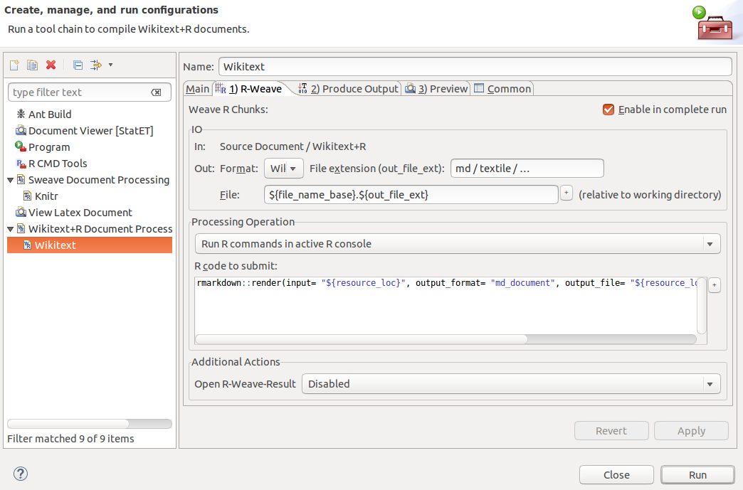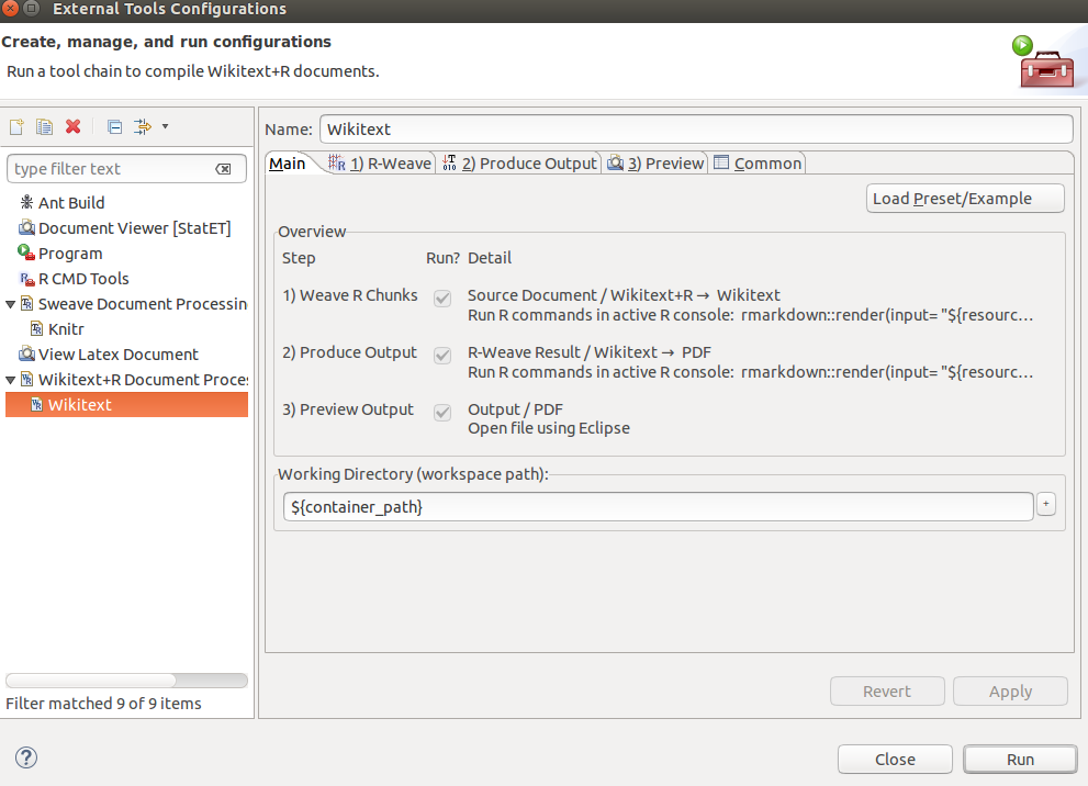我为这个问题挣扎了一段时间。我使用的是带有R的StatET插件,我想将它配置为编译Rmarkdown文档。为了做到这一点,我生成了一个基于默认预设的配置设置(PDF使用Rmarkdown,两个步骤)。我使用的是StatET 3.5.1和EclipseNeon4.6.0。