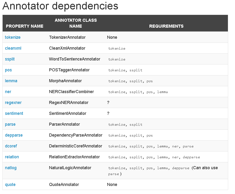 您是对的,如果提供的唯一注解器是“tokenize”,则API似乎没有响应。它应该默认为PTBTokenizer,就像文档中提到的那样。这里还有另一个相关的问题:斯坦福CoreNLP给NullPointerException。但是,如果您只想标记而不做其他操作,则可以: