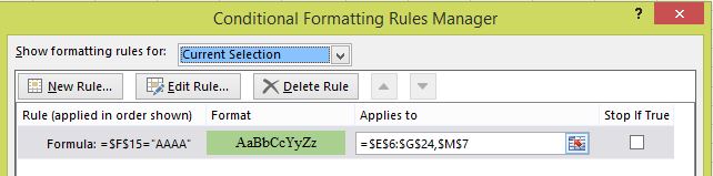 =$F$15="AAAA"适用于$E$6:$G$24。