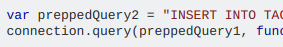 var preppedQuery3 = "INSERT INTO MOMENTS_TAGS (MOMENT_ID, TAG_ID) VALUES (" + result1.insertId + "," + result2.insertId + ")";
