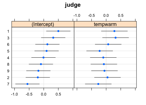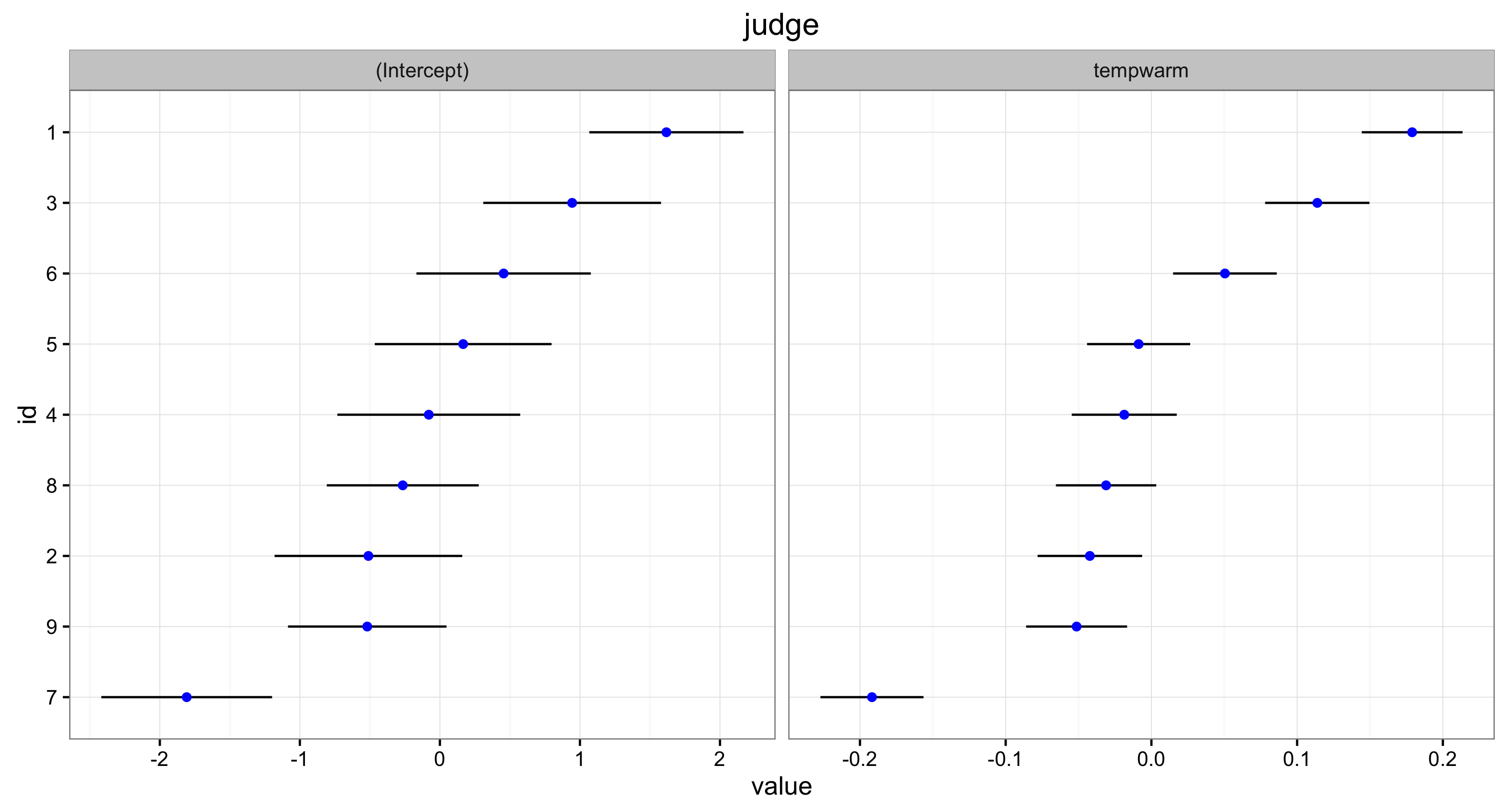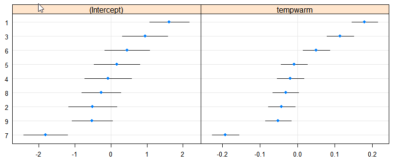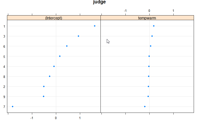 我最好的猜测是,评级是按照clmm下的顺序实现的,考虑到错误信息,这对我来说似乎是有意义的。然而,猜测是高度投机的,我不知道如何处理这种情况。具体来说,我想要绘制的是临时的随机效应和判断(拦截)与他们的顺式。请参考下面我用下面的代码生成的图