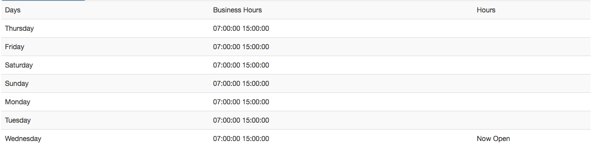 如果它是关闭或开放的话,我正试图对它的日子、时间和业务状态进行排序。我得到的结果,但他们没有适当地工作,以满足需要。我的约会和时间安排得很好,但我的状态(不管是开放还是关闭).因此,这里是我的代码,请看屏幕截图。今天是星期四,然后状态应该显示在星期四,其余的日子应该是空白的。