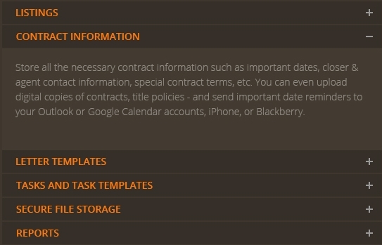 <p class="para">Store all the necessary contract information such as important dates, closer & agent contact information, special contract teams, etc. You can even upload digital copies of contracts, title policies - and send important date reminders to your Outlook or Google Calendaraccounts, iphone or Blackberry.</p>