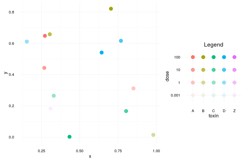 它一定是传说中的网格吗?如果您愿意有一个毒素(颜色)图例和第二个剂量(alpha)图例,您可以使用这个图例(并将您的颜色/填充设置为对您的数据有意义的内容)。