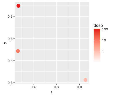 baseplot <- ggplot(mapping = aes(x = x, y = y, color = dose))第一层本身看上去很有希望: