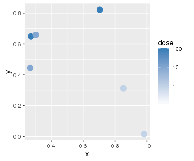 "), header = TRUE)我想对这些数据做一个散点图,其中毒素是用点的色调表示的,而剂量是用它们的亮度表示的(近似地说,低剂量应该对应于高亮度)。