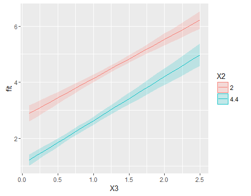 ggplot(pred.df, aes(x=X3, y=fit, group=X2, colour=X2, fill=X2)) + geom_line() +