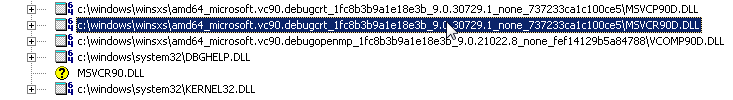 最后,我试图检查应用程序的依赖性,结果发现了一些奇怪的东西。有两个MSVCR90库作为应用程序的依赖项-- msvcr90d.dll和msvcr90.dll。我不知道这个库的非调试版本是如何进入我的应用程序的。