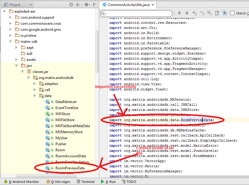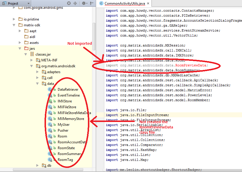 你自己正在构建矩阵SDK工件,然后将它导入到项目中,这是正确的吗?如果是,请验证构建日志,并查看文件是否实际打包成工件(实际上,您甚至可以将其作为存档检查)。