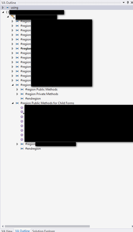 您可以在“视觉辅助”扩展中看到当前区域。您应该从Nuget下载它(工具->扩展和更新,然后搜索)。安装之后,您将看到一个名为"VA大纲“的新选项卡,它位于解决方案资源管理器选项卡附近。
