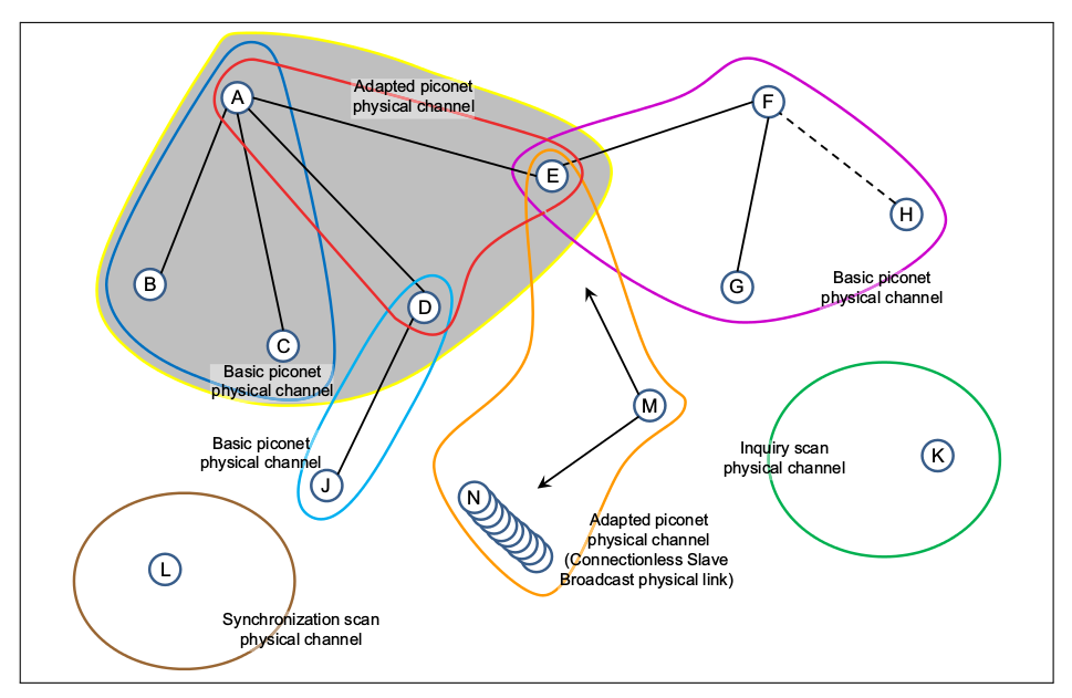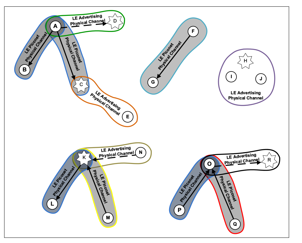 注:- BLE具有基于星型的网络拓扑结构,每个微微网的最大设备为8,包括主网络--请帮助我理解/可视化我所学到的上述理论。