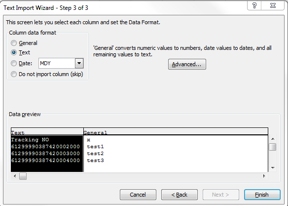 根据所做的评论(Scott在评论中提到的),我认为您正在excel中直接打开CSV。你不能这么做。Excel将做最好的解释每种数据类型。由于跟踪号码是数字,它会把它们作为一般的,然后你会遇到特性在前面提到的答案(@JosephKreifelsII错误.你的)。要解决这个问题,您必须导入文档。DO NOTsimply在中打开CSV。