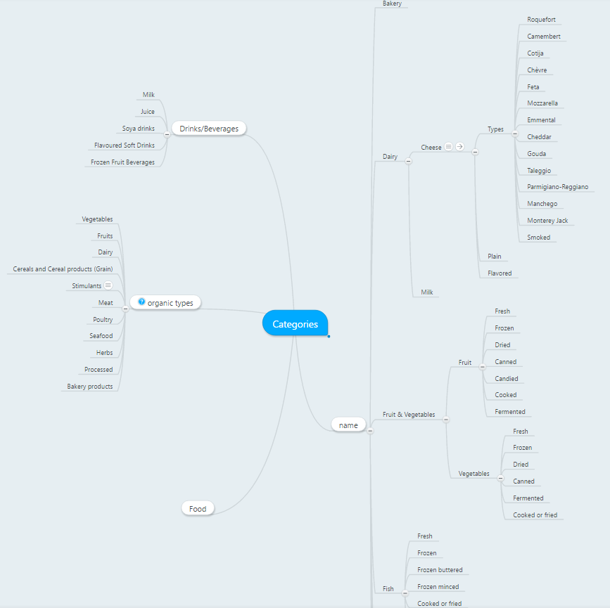 你所拥有的食物类别会更好地组织在等级结构中。作为关系数据库,您将有重叠,这取决于您如何组织产品。理想情况下,你要不惜一切代价避免多对多.