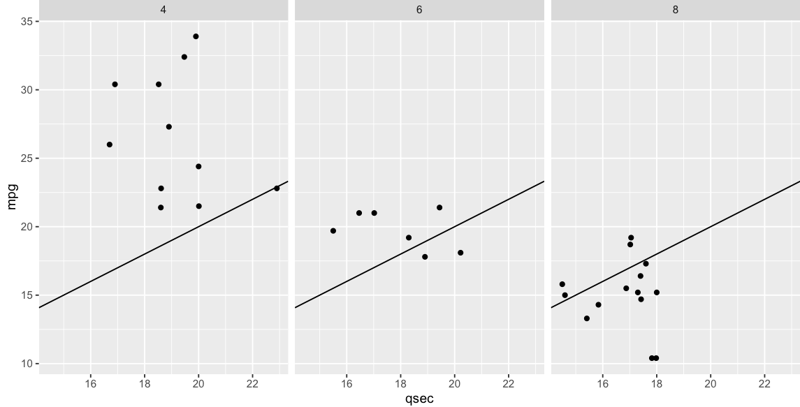 p <- ggplot(mtcars, aes(qsec, mpg)) + geom_point() + geom_abline() + facet_wrap(~cyl)