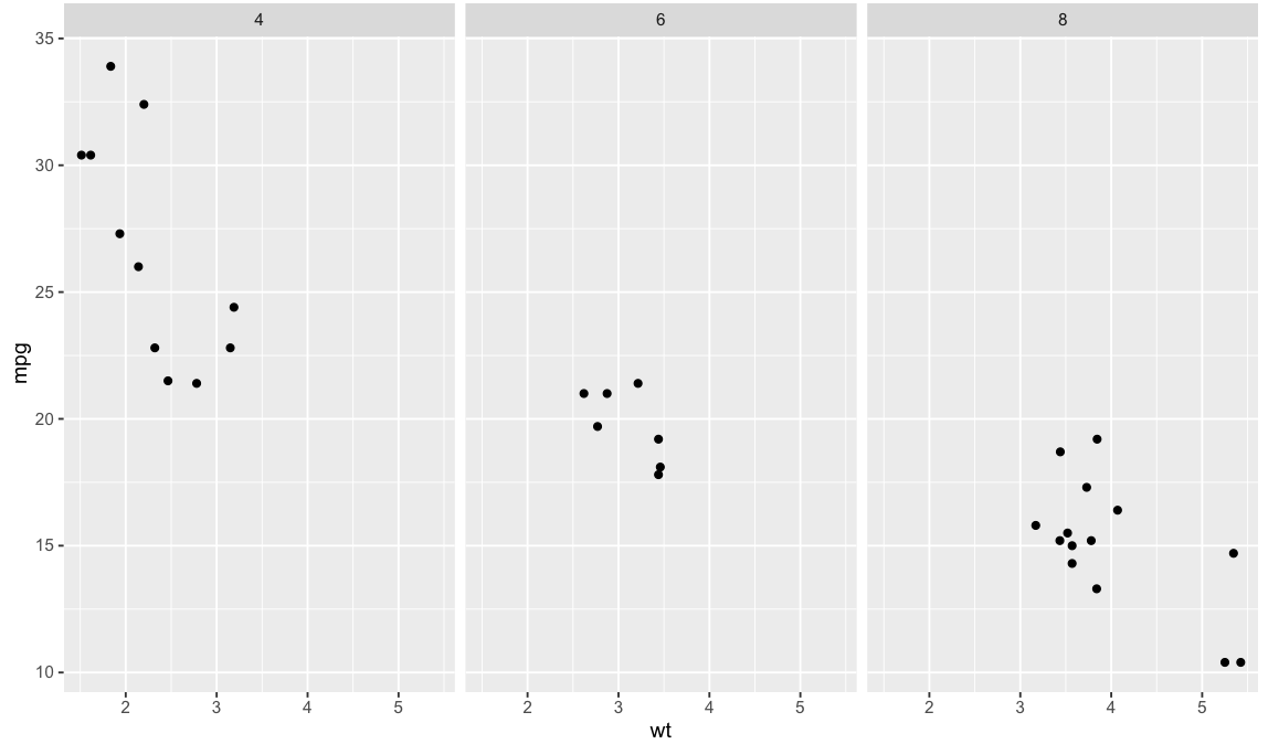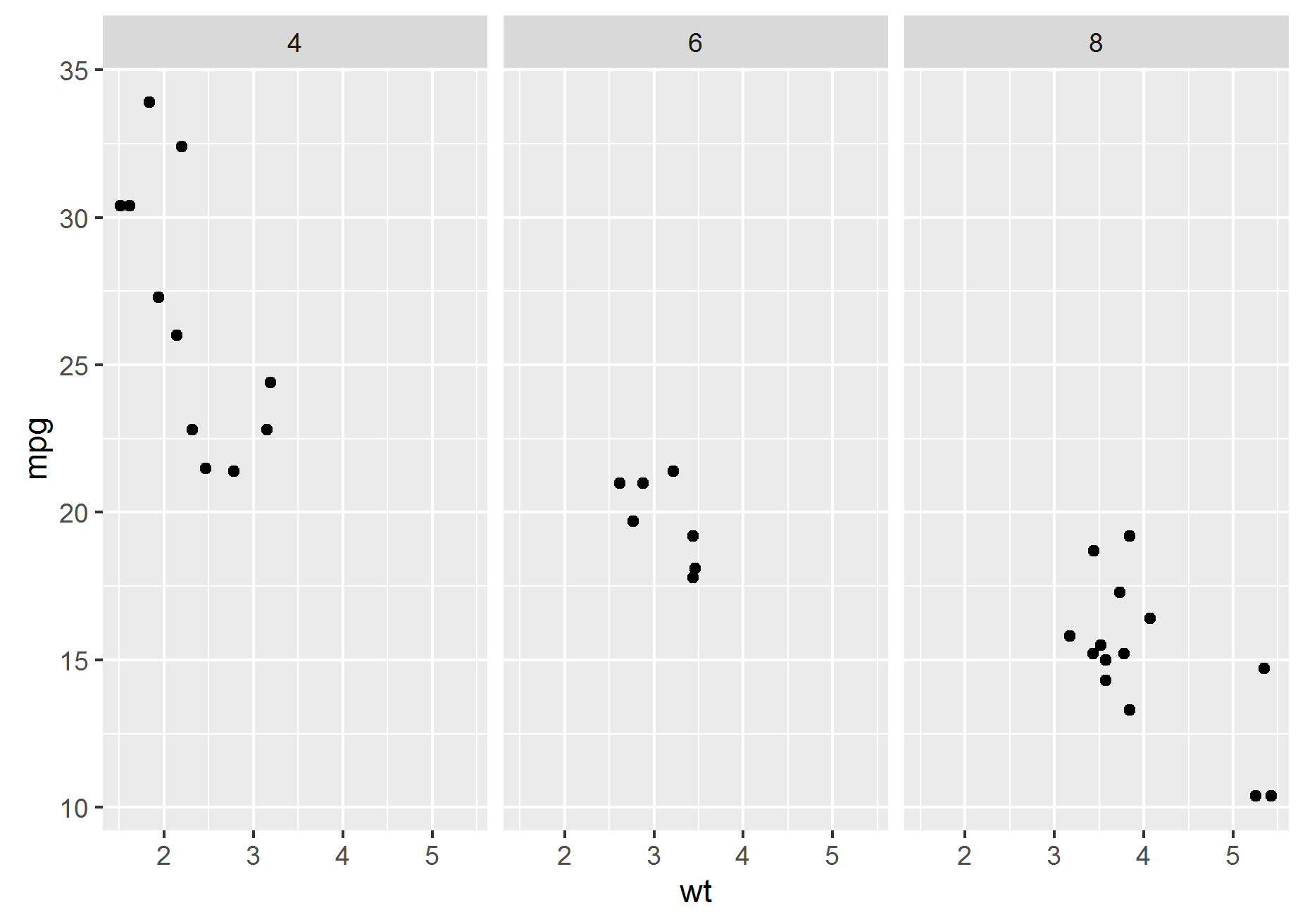 p + geom_smooth(method = "lm", se = FALSE) + facet_wrap(~cyl)