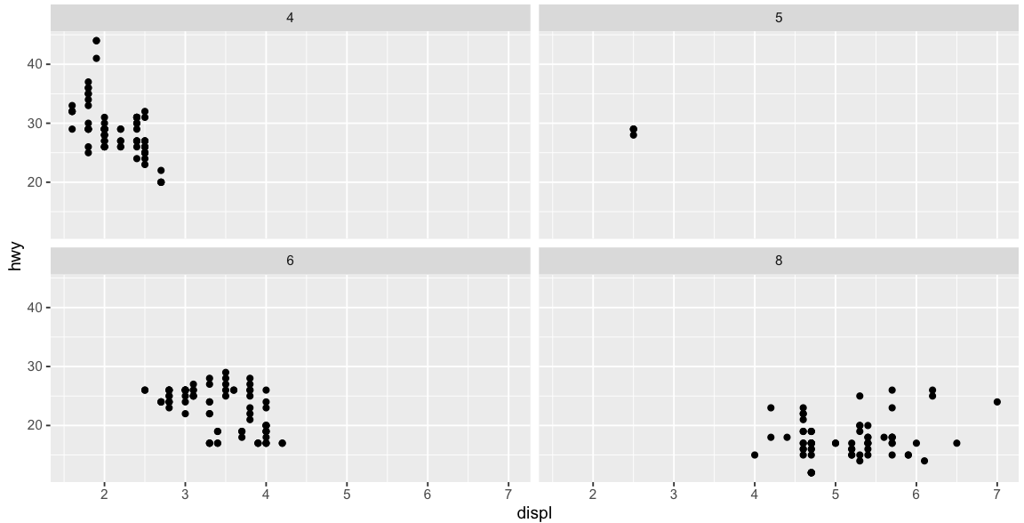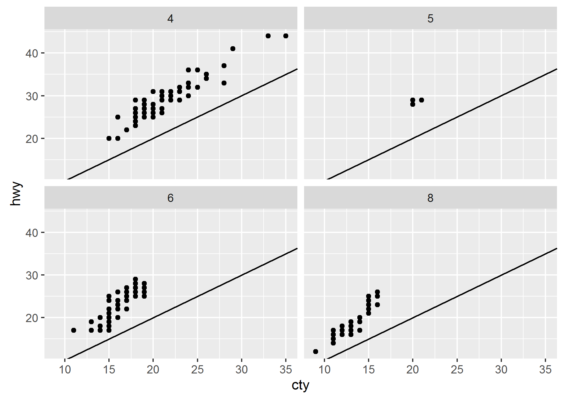 ggplot(mpg, aes(displ, hwy)) + geom_point()+geom_abline() + facet_wrap(~cyl)