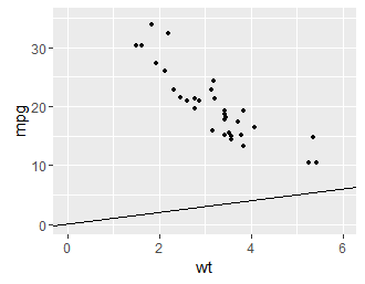 ggplot(mtcars, aes(wt, mpg)) + geom_point() + geom_abline() + lims(x = c(0,6), y = c(0,35))