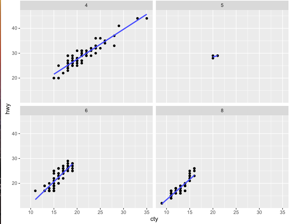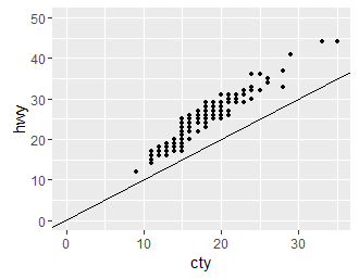 它实际上取决于在美学中抛出的两个变量的比例(即两个映射变量)。如果您在脚本中仔细注意到绘制mpg数据,那么您将hwy与city进行比较。让我们仔细研究其中的每一个: