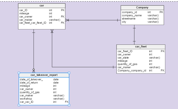 您还需要一个表来包含每个汽车的当前状态。表car_takeover_report似乎是所需的大部分内容,只需删除mileage、car_owner和car_maker,因为它们在与car表的连接中可用。