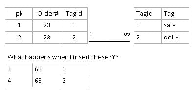 根据您的形象,我要说,tblTAG和tblOrder之间有一对多的关系。在这张图片中,我没有看到多到多的关系,添加这些记录根本不会产生任何问题。