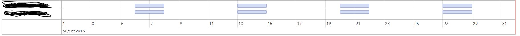有没有办法强迫你上周六和周日的课。我设置了按员工分组的时间线,以显示每月的视图,但无法将星期六和周日的时间安排到如何进行。我得放大才能显示出来。我试着为每个员工添加星期六和星期天的人工,但是结果不一样,不能让整个列都变暗。是否有任何我可以实现的阴影看起来像内置版本与每月的看法?